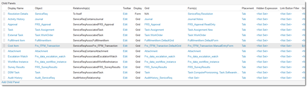 b. | Set the following in the FormView Child Panel Relationship Editor. See About Tracking Cost Relationships in a Service Request. |