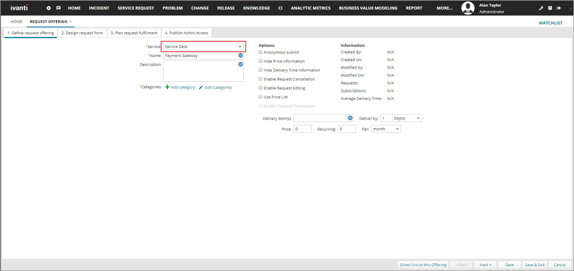 3.Create a new request offering and select the name of the SLA Subscription from the Service drop-down list. For more information, see Creating a Request Offering.