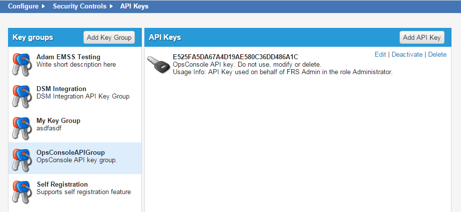 1.From the Configuration Console, click Configure > Security Controls > API Keys to open the API Keys workspace. The application displays the API keys.