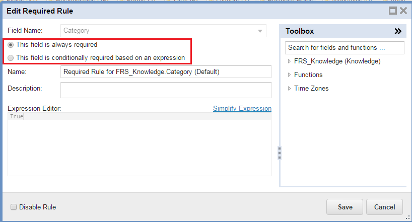 •Select This field is conditionally required based on an expression and set a condition for when this business rule is required. If the condition evaluates to true, the field is required.