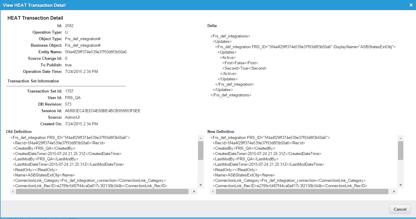 The frs_ops_change_log business object stores historical changes in XML format for all metadata and settings, and for some data such as request offerings and authentication provider data. You can view the list of changes in the Transaction Details workspace.