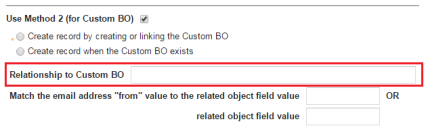 5.In the Match the email address from value to the related object field value field, enter the display name of a valid business object field from the related business object. This value is required. This field cannot be empty when you check Use Method 2 (for Custom BO).