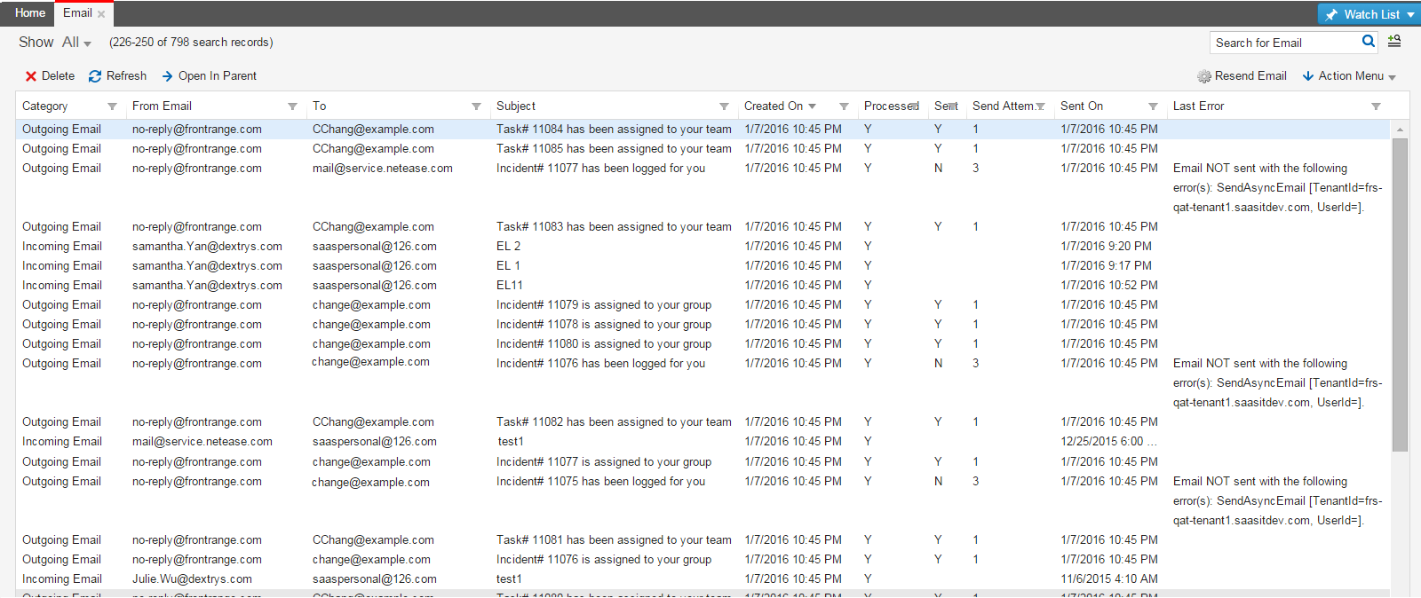 •The Processed status for emails is set to Y or N. See About Processing Incoming Emails for information about processing emails.