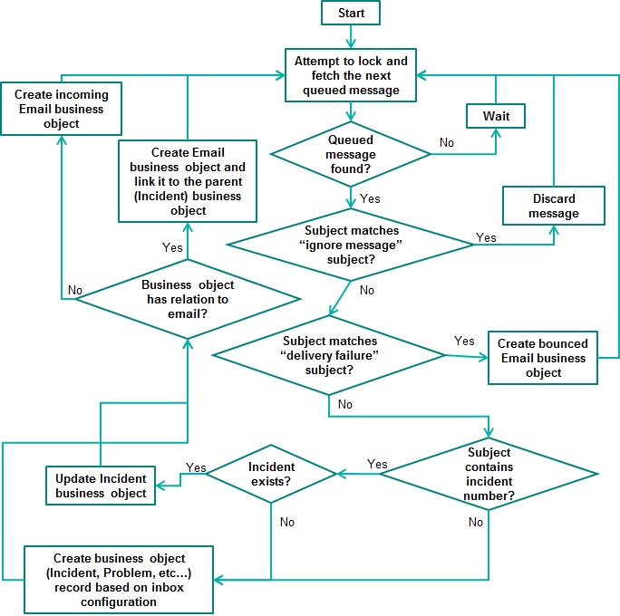 The following flowcharts shows how incoming emails are processed by the email listener: