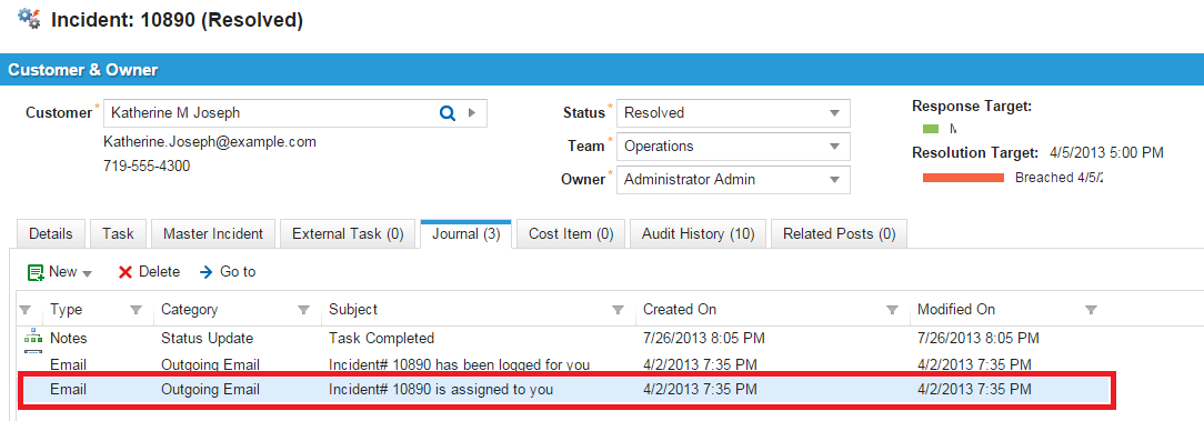 In this example, the last email in the list was generated by a workflow, but you can also track emails created within the incident record (see Using Email).