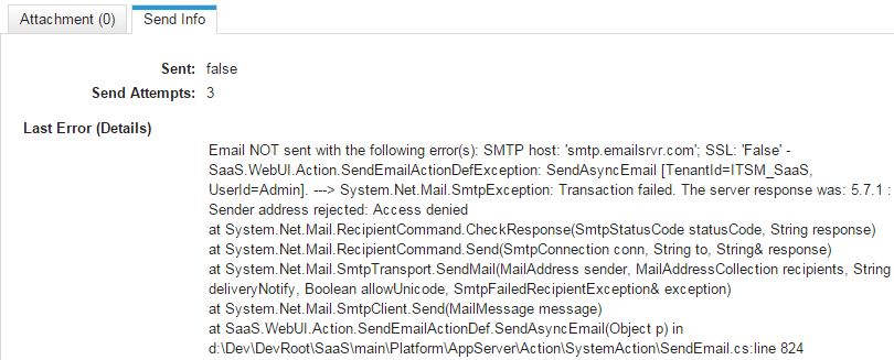 The value of the Sent parameter is false, which means that the email did not go through. The application lists the number of attempts and shows any errors.