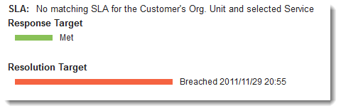 The response target uses the response escalation schedule, and the resolution target uses the resolution escalation schedule. If service level agreements are configured for a service, the escalations that are configured within the service level agreement override the default application escalations. If another service is selected, the application stops the previous escalation clock and marks the records of the previous escalation schedule as obsolete. At this time, a new escalation schedule goes into effect.