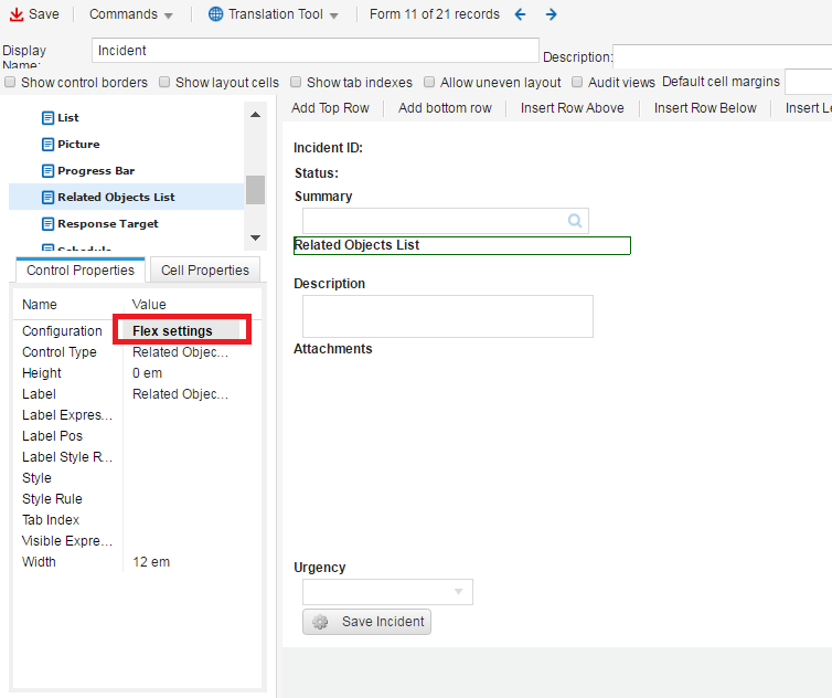 6.From the Control Properties tab on the left pane, for the Configuration field, click Flex Settings. The application displays the Related Objects List dialog box.