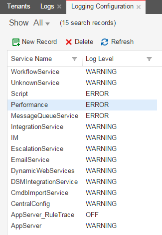 To enable the Performance web service call, its severity level must be DEBUG or INFO. You set this value in both the Configuration Database (ConfigDB) for the entire application, and in the tenant for each individual tenant.