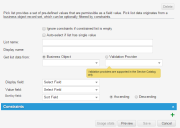 Specifies where to get the pick list data from: Business Object: Select a business object, then select a value from the drop-down list. Validation Provider: Supported in the Service Catalog only, and used only for the Ivanti DSM legacy integration . For the Ivanti DSM legacy integration, select an item from this list and the application generates a pick list based on the hard-coded logic in the code. |
