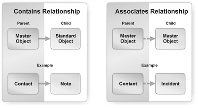 •Contains: The child business object belongs to, and is dependent on, the parent business object. The application loads, saves, and deletes the child business object with its parent business object. These relationships are listed under the Relationships tab.