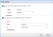 5. Add one or more expressions to your individual filter. The control type you chose in step 4 determines the content displayed in the Expression area. For example, if you selected Calendar, the application displays the following choices: