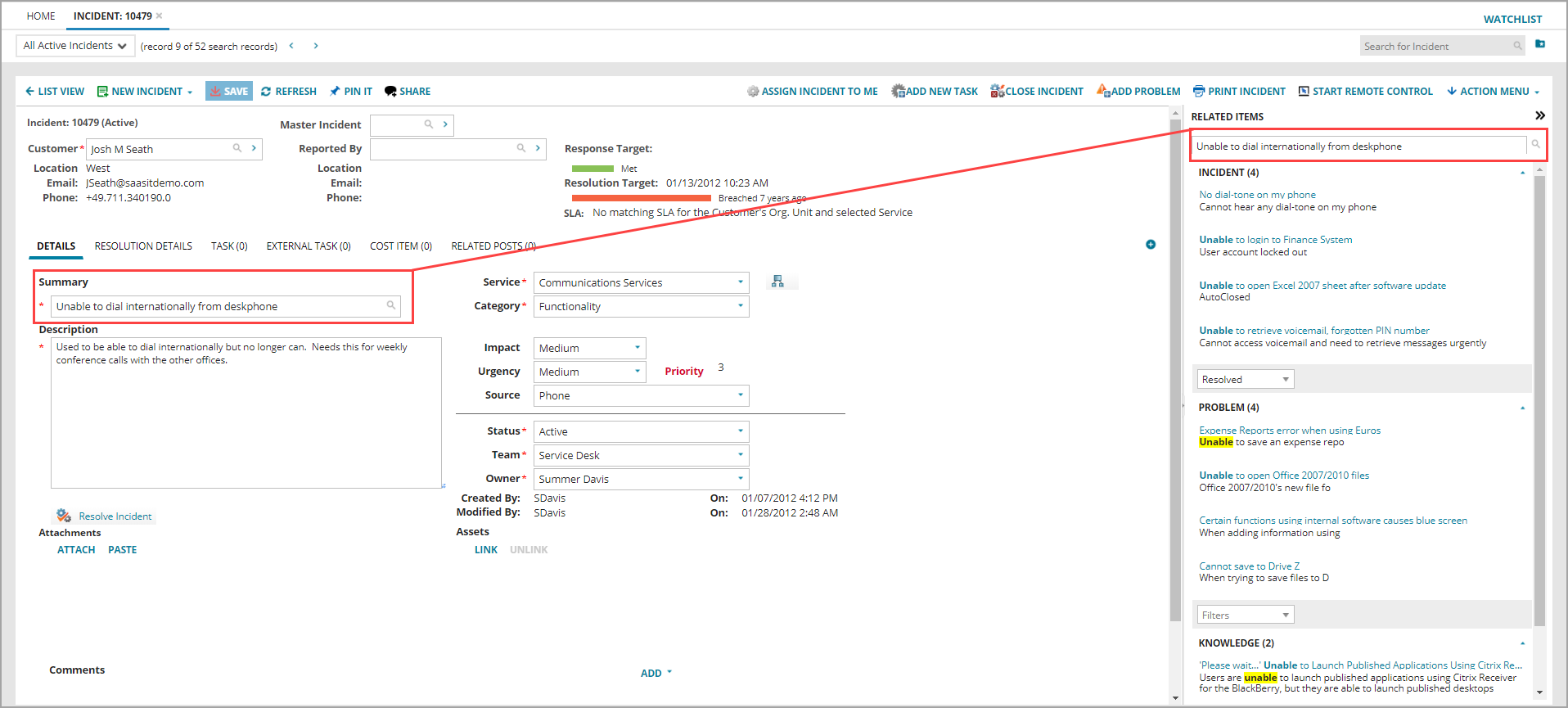 •From a field on a form that has an associated search icon. An example is the Summary field on the Details tab for an incident. The application displays the results in the Related Items pane (see Using Related Items and Object Matching).