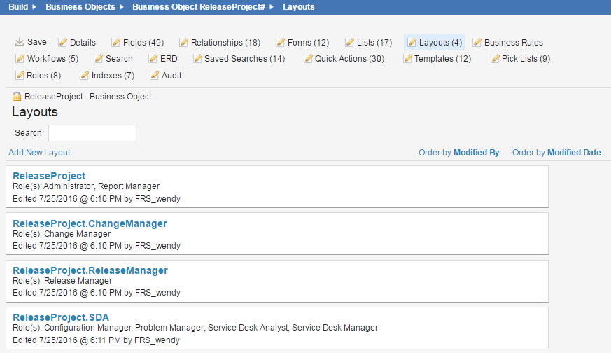 3.Click the Layouts tab. The application displays a list of all the layouts used for this business object.