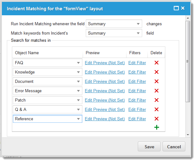 The application ranks the business objects that match the search criteria by how closely they match the current business object. The application lists these matching business objects in the search results panel in the form of the current business object. The Incident, Knowledge, and Problem business objects have object matching enabled by default.