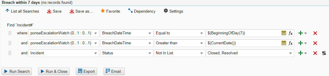 This topic describes how to create a saved search that searches for records that will breech within a specific time, in this case, records that will breach in the next seven days. This search uses expressions.