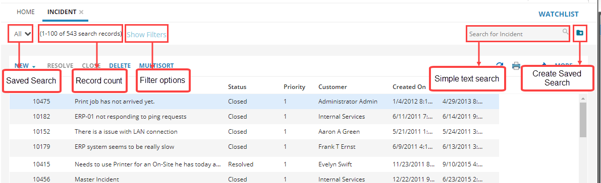 The All link, displays the list of Saved Search. You can choose to apply any of the Saved Search that is available for your user role. Saved Search provide allows you to create custom search and save for repeated use. See Using Saved Search. You can also create a new saved search by clicking the create new saved search icon on the right.