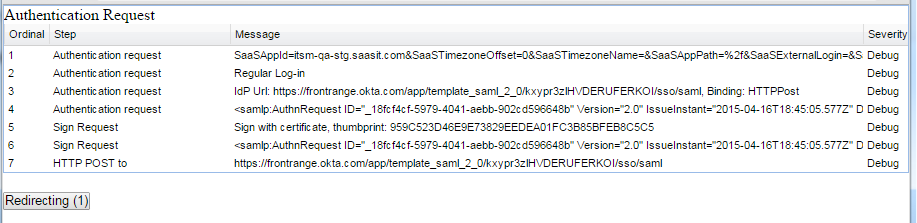 2.To see the authentication request log, click Redirecting to pause sending the request to the server. This cancels the immediate redirection and the browser is not redirected until you click Redirecting again. If you do not click Redirecting, the application redirects you to the identity provider URL and you do not see the messages until authentication succeeds.