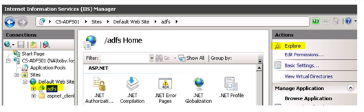 1.Open Microsoft IIS Manager, select the adfs virtual directory, and click Explore.