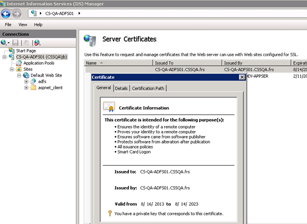 2.Double-click to open Server Certificates in features view. Click the certificate that is assigned to Microsoft IIS. Ensure this certificate has a private key.