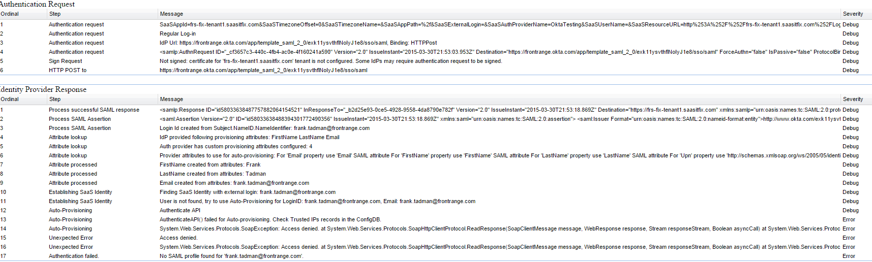 After logging into the identity provider, both the authentication request and response log messages are available.