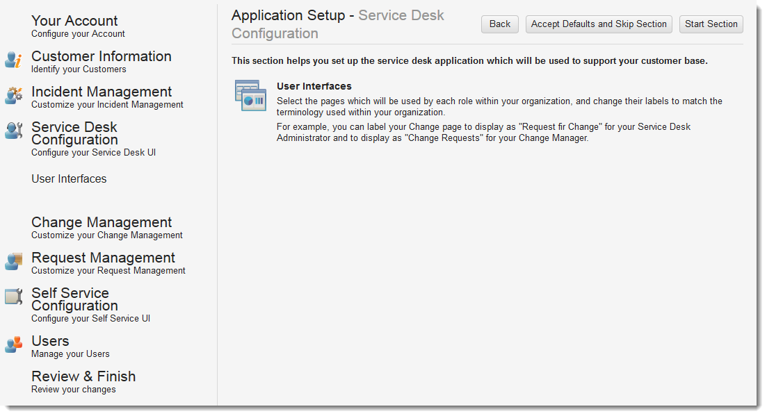 Use the Application Setup - Service Desk Configuration page to define the access and workflow for information collected and acted upon by the service desk in your company.