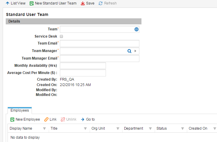 2.Click New Standard User Team. The application displays a blank Standard User Team workspace.