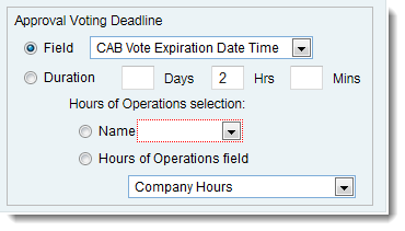 •Specify the approval timeout using a duration that uses hours of operation and the creation time of the approval vote