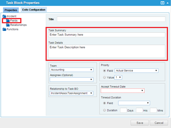 This workflow block does not support the use of functions or expressions, except for limited support for the Task Summary and Task Details fields. If you need to use functions or expressions, use the Extended Task workflow block. See Extended Task Workflow Block.