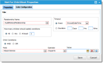 The Wait for Child workflow block waits for one of the following: a condition specified in the block to become true for a child business object, or for a timer to expire. By default, exit ports for this block allow for separate workflow paths based on these events.