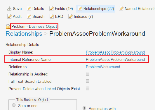 •InternalReferenceName distinguishes one relationship from another. There are times when there is more than one relationship between the same parent and child business objects (for example, incident to employee). In such cases, the application uses the internal reference name of the relationship to distinguish between the relationships. This parameter is specified after the period.