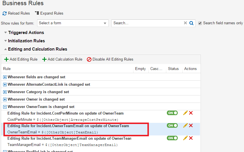 Second, (with the OwnerTeam field validation in place), define an editing rule against the OwnerTeam field in the incident, so that when this field is changed, the rule returns the field value of the validated business object (that is, the other object). See the following example:
