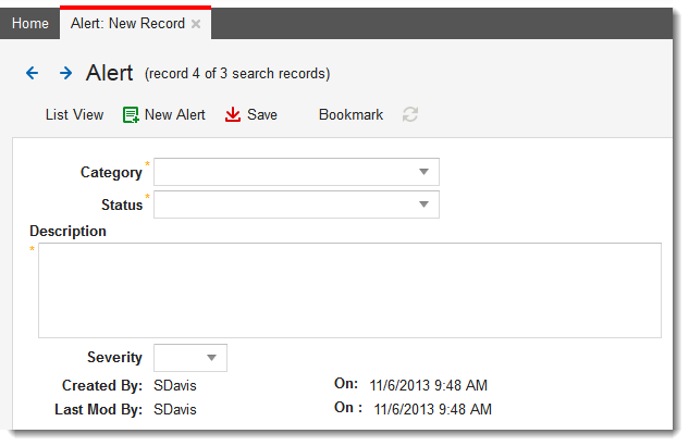 3.From the toolbar, click New Alert. A blank alert form appears.