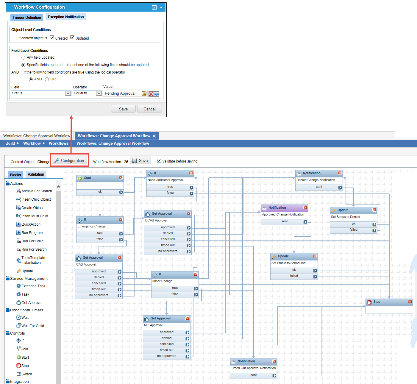 After you review the change request and add the necessary information to it, update the change request status to pending approval to trigger the change approval workflow (if approval is required for the type of change).