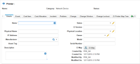 3.Choose a template from the New drop-down list. For example, select New Printer. Each template has different fields and tabs. Service Manager provides many out-of-the-box templates for different configuration item types. In addition to the common attributes that are required across all configuration item types, these configuration item templates accommodate configuration item details of varying complexity.