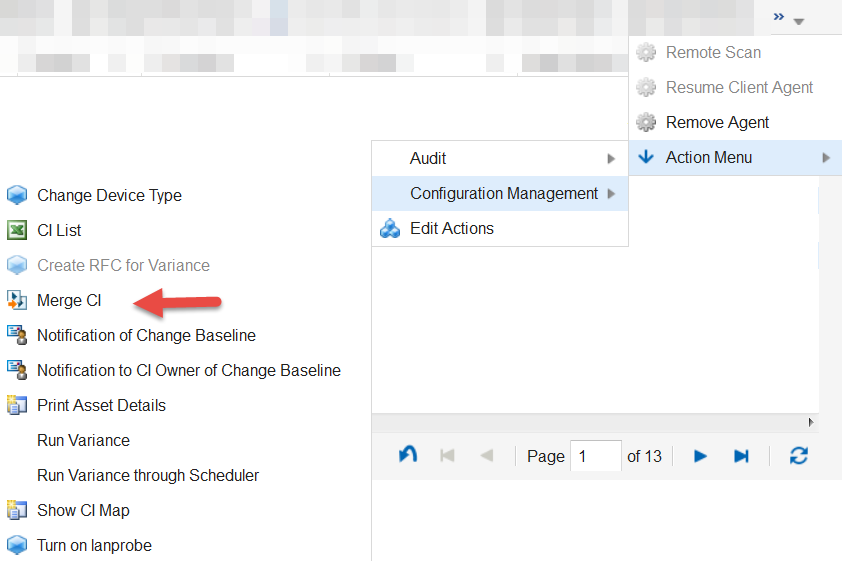 4.After you select the configuration items, click the workspace toolbar drop-down arrow (on the right), and select Action Menu > Configuration Management > Merge CI.