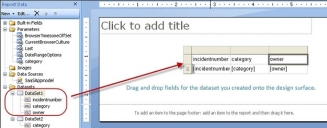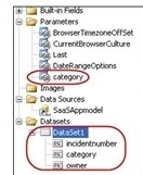 6.Enter your query. For example, a simple query to get all incidents by categories, showing the incident number and owner is as follows: Select incidentnumber,category,owner from incident where category in (@category). In this example, @category is taken by Microsoft SSRS as a parameter. When running the query, the system prompts you for the value. You can provide any value to test the query. The system automatically creates the category parameter and automatically maps it to the dataset.