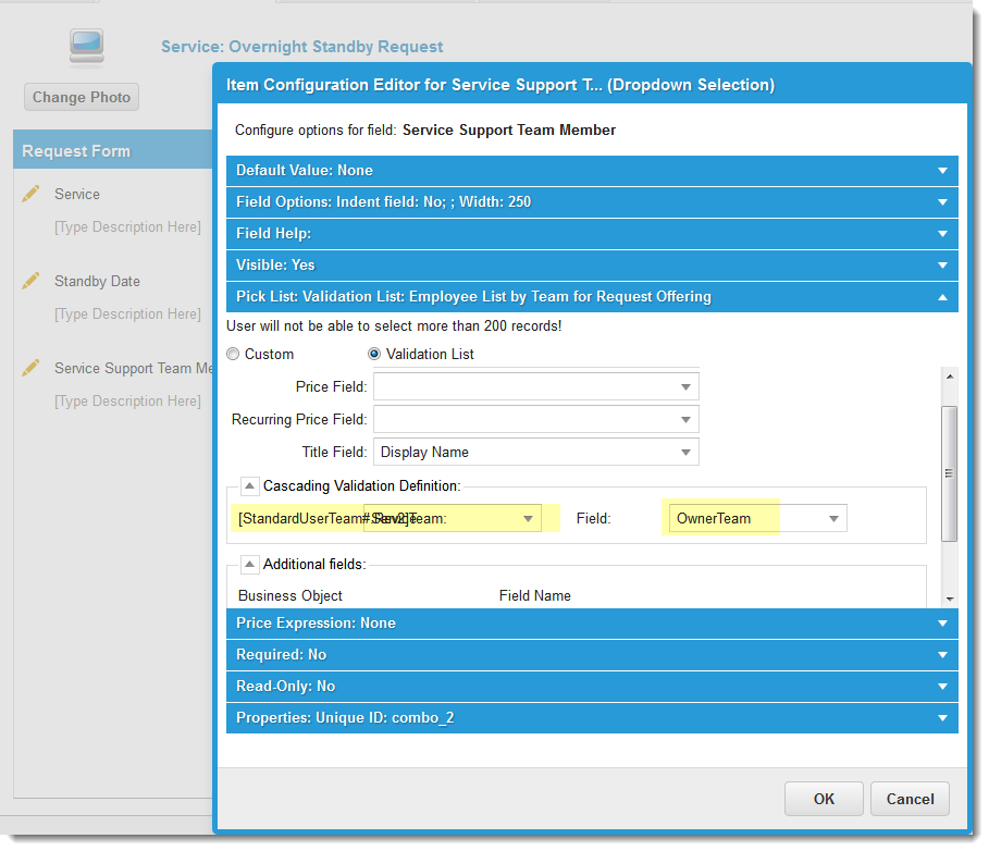 This example illustrates how to trigger values from additional fields or a combo box (cascading validation list) by creating a service that uses a value based on the OwnerTeam field.