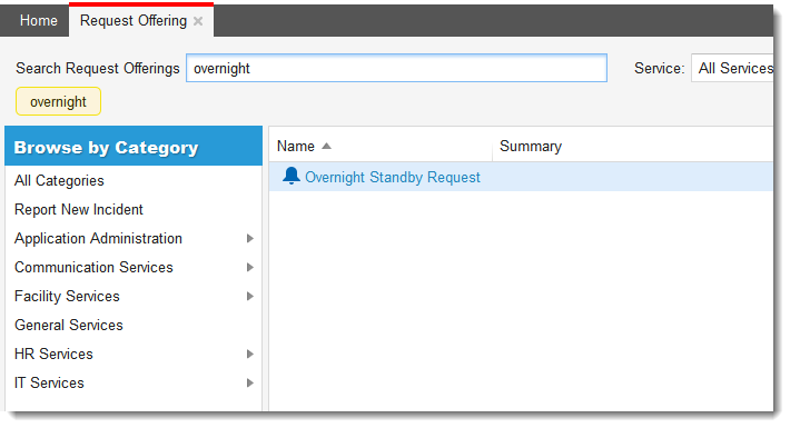 3.Enter overnight in the Search Service Offerings text box. The Overnight Standby Request offering opens.
