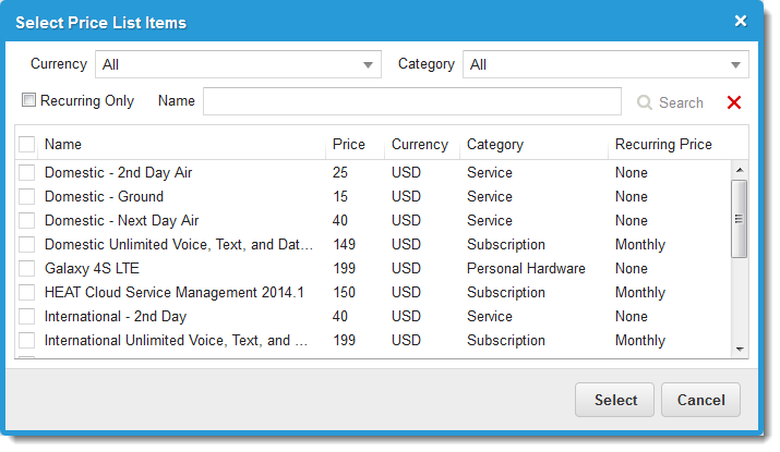 2.Click Add from Price List. The Select Price List Items window opens. This adds a base price to your request offering.