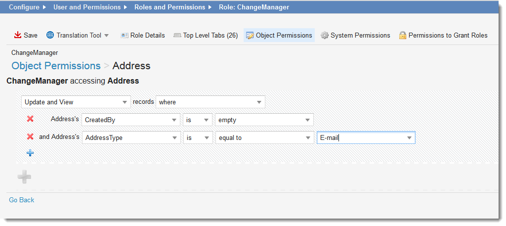 If one role has both Update and View and also View permissions for the same business object, the system gives you Update and View permission. Enter the criteria, then click Update. |